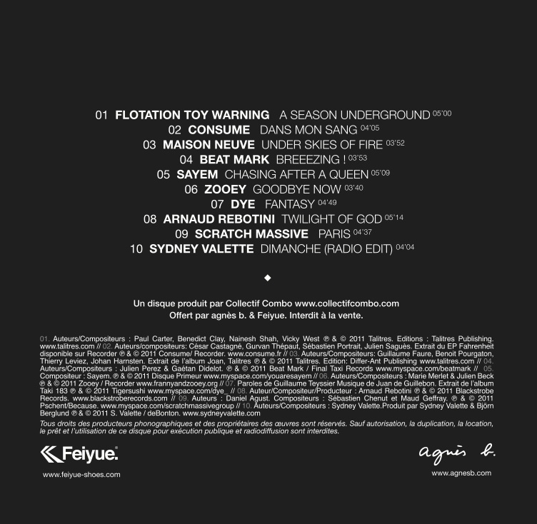 Collectif Combo a assuré la direction artistique et la production d’une compilation musicale réunissant des nouveaux talents comme Consume, Zooey, Maison Neuve, des artistes confirmés (Scratch Massive et Flotation Toy Warning) et des pointures à l’instar d’Arnaud Rebotini qui était avec les Scratch venu assurer le show pour le lancement du projet au Nouveau Casino, jeudi 1er décembre 2011.